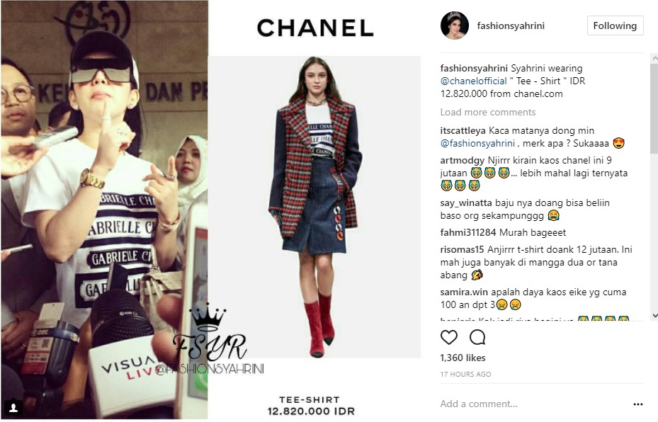 Saat itu, Syahrini mengenakan kaus putih berlengan pendek. Siapa sangka, meskipun kaus dengan merek terkenal itu terlihat sederhana, harga yang melekat cukup "mencekik". Bagaimana tidak, satu kaus dibandrol dengan harga nyaris Rp 13 juta. "Syahrini wearing @chanelofficial " Tee - Shirt " IDR 12.820.000 from chanel.com," tulis akun @fashionsyahrini dalam keterangan postingannya.