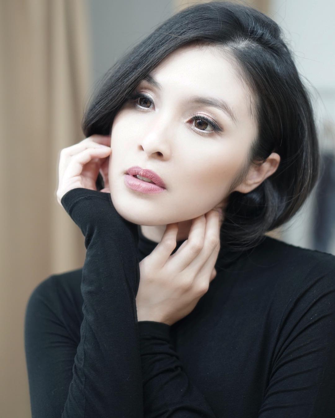 Sandra Dewi nampak cantik mengenakan baju ketat dan tanktop dalam potret warna abu-abu yang elegan.