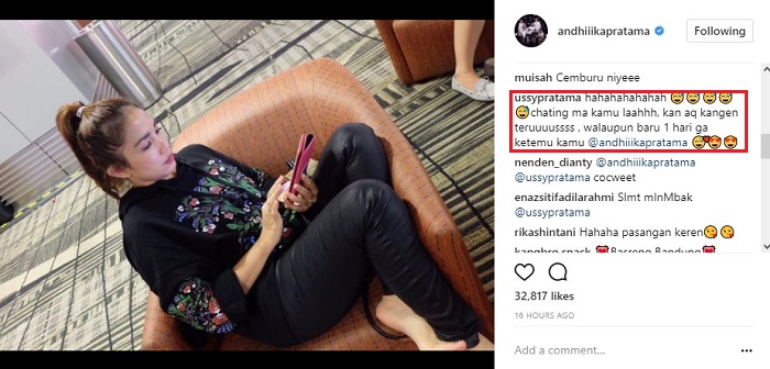 Melalui postingan di Instagram pribadinya, tampak Andhika mengunggah foto sang istri yang tengah duduk santai di sofa berwarna coklat. Dengan setelan pakaian kasual, terlihat Ussy yang tengah sibuk dengan handphone miliknya. Jelas saja, Andhika yang tengah berjauhan dengan Ussy tampak curiga dengan aktivitas sang istri. "Hayo mentang2 jauhan chatting ma siapa? @ussypratama," tulis Andhika seolah menggoda Ussy.