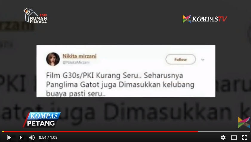 Bertepatan dengan peristiwa sejarah penculikan dan pembunuhan enam jenderal dalam peristiza Gerakan 30 September 1965 silam, Nikita Mirzani menulikan cuitannya itu. Ia membahas soal penayangan ulang film G30S/PKI dan Jenderal TNI Gatot Nurmantyo. "Film G30s/PKI Kurang Seru.. Seharusnya Panglima Gatot juga Dimasukkan kelubang buaya pasti seru.." tulis wanita yang akrab disapa Niki itu.