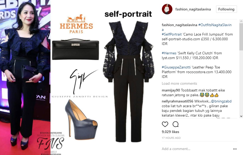Meskipun ajang penghargaan itu telah berlalu, rupanya para penggemar belum move on dari penampilan Gigi. Bahkan, mereka semakin heboh usai mengetahui total harga pakaian, tas serta sepatu yang digunakan Gigi saat itu. Bagaimana tidak, Gigi harus mengeluarkan dana sekitar Rp 177.900.000 untuk menyempurnakan penampilannya itu. "#OutfitsNagitaSlavina #SelfPortrait 'Camo Lace Frill Jumpsuit' from self-portrait-studio.com £350 / 6.300.000 IDR #Hermes 'Swift Kelly Cut Clutch' from lyst.com $11,550 / 158,200.000 IDR #GiuseppeZanotti 'Leather Peep Toe Platform' from rococostore.com 13.400.000 IDR," tulis akun @fashion_nagitaslavina dalam keterangan postingannya.