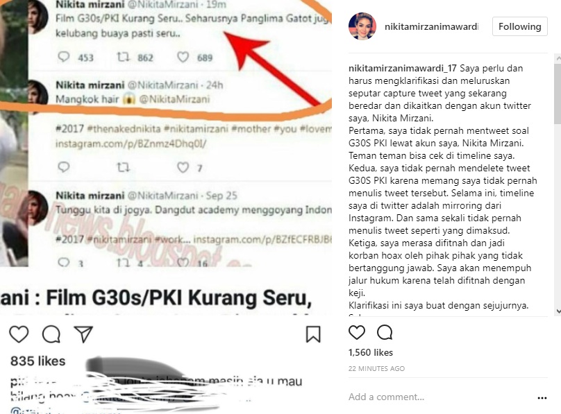 Sambil menyertakan cuitan yang kabarnya telah menghilang dari akun Twitter-nya, Niki menegaskan bahwa dirinya tak pernah melakukan seperti yang telah dituduhkan. "Pertama, saya tidak pernah mentweet soal G30S PKI lewat akun saya, Nikita Mirzani. Teman teman bisa cek di timeline saya. Kedua, saya tidak pernah mendelete tweet G30S PKI karena memang saya tidak pernah menulis tweet tersebut. Selama ini, timeline saya di twitter adalah mirroring dari Instagram. Dan sama sekali tidak pernah menulis tweet seperti yang dimaksud," tutur Niki lagi.