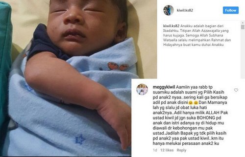 Namun yang mengejutkan, postingan Kiwil tersebut dikomentari dengan ketus oleh istri keduanya, Meggy. "Aamiin ya rabb tp suamiku adalah suami yg Pilih Kasih pd anak2 nyaa..sering kali ga bersikap adil pada anak disini Dan Mamanya lah yg slalu jd obat luka hati anak2nya..Adil hanya milik ALLAH Pak ustad kiwil jd jgn suka BOHONG pd anak dan istri adanya sy di hidup mu diawali dr kebohongan mu pak ustad. Jadilah Bapak yg tdk pilih kasih pd anak2 yaa pak ustad kiwil..krn itu hanya melukai perasaan anak2ku," komentar panjang Meggy mengungkap unek-uneknya.