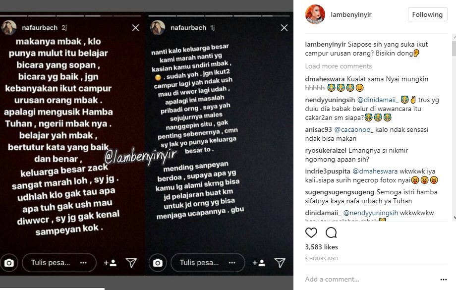 Postingan yang diunggah ulang oleh akun gosip @lambenyinyir itu pun menuai berbagai komentar netizen. Meskipun tak dijelaskan siapa wanita yang dimaksud dalam postingan itu, tak sedikit netizen yang menuding jika Nafa menyindir Nikita Mirzani. Pasalnya, beberapa waktu lalu, Nikita Mirzani sempat memberi keterangan soal Zack Lee dan Nafa Urbach dalam sebuah wawancara salah satu media infotainment.