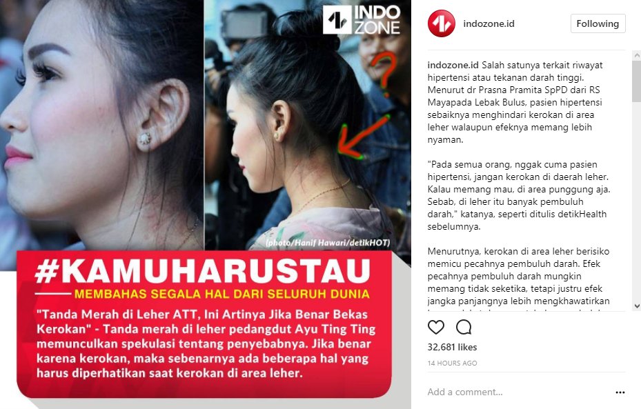 Sontak, postingan itu menuai berbagai komentar netizen. Alih-alih soal pembahasan medis, tak sedikit netizen jsutru menuding tanda merah di leher Ayu Ting Ting sebenarnya bukanlah bekas kerokan.