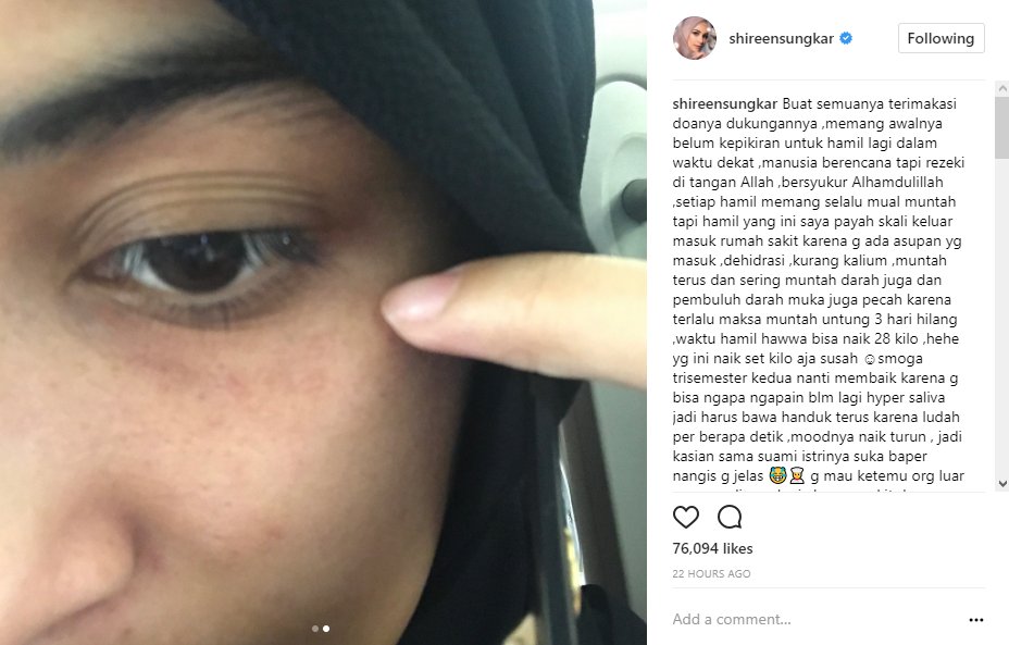 Cobaan Shireen tak berhenti di situ saja. Keinginan meludah yang berlebihan hingga mood yang terlalu cepat naik turun pun dialami Shireen. "smoga trisemester kedua nanti membaik karena g bisa ngapa ngapain blm lagi hyper saliva jadi harus bawa handuk terus karena ludah per berapa detik ,moodnya naik turun , jadi kasian sama suami istrinya suka baper nangis g jelas. g mau ketemu org luar maunya dirumah aja karena sakit dan ludahnya terlalu banyak," katanya.