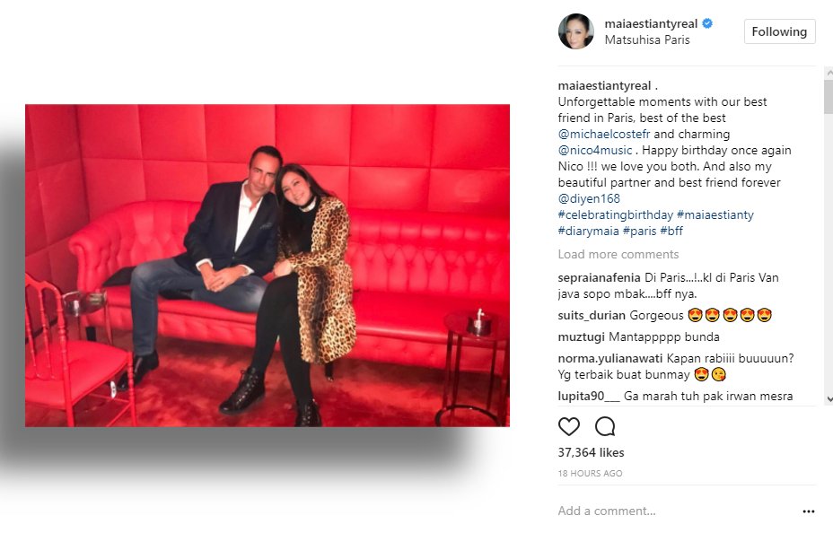 Dalam keterangan postingannya, rupanya pria bule itu adalah salah seorang rekannya di Paris. "Unforgettable moments with our best friend in Paris, best of the best @michaelcostefr and charming @nico4music . Happy birthday once again Nico !!! we love you both. And also my beautiful partner and best friend forever @diyen168 (Momen yang tak terlupakan dengan temanteman kami di Paris, pria terbaik @michaelcostefr dan pria menawan @nico4music . Selamat ulang tahun sekali lagi Nico !!! Kami sangat mencintai kalian berdua. Dan juga parter cantikku serta teman terbaik selamanya @diyen168)," tulis Maia dalam keterangan postingannya.