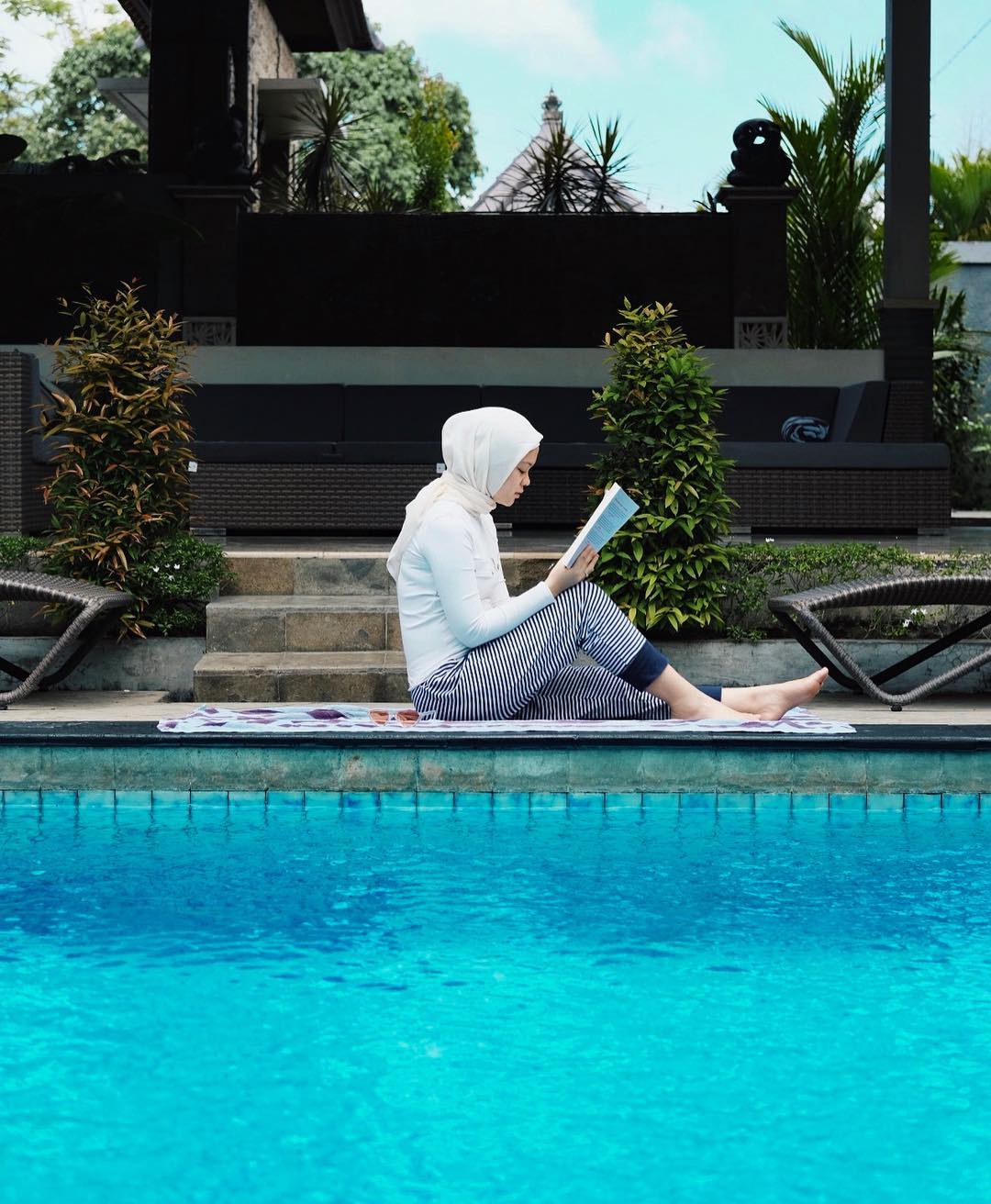 Meskipun sedang liburan, Tantri rupanya juga tak melupakan kegiatan rutinnya setiap pagi, yakni membaca buku.
