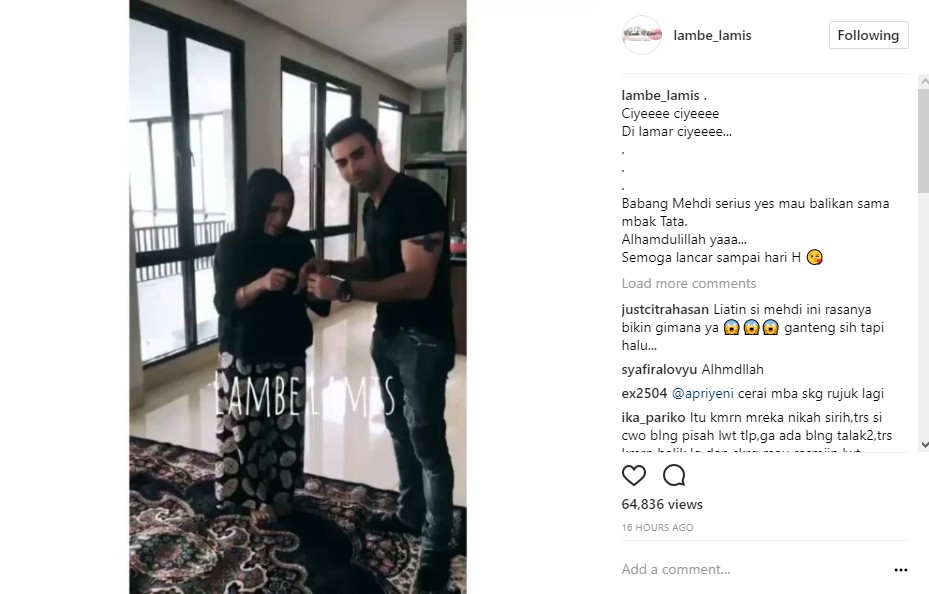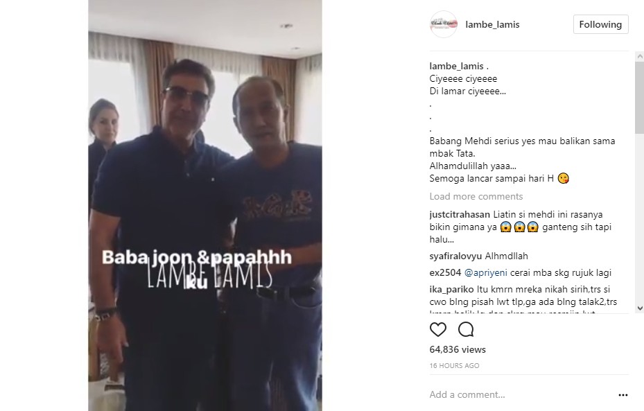 Kehangatan keluarganya terus berlanjut ke jamuan makan siang. Berbagai hidangan ala Sunda telah tersedia di atas meja makan. Meskipun tak berasal dari Indonesia, kedua orangtua Mehdi tampak menikmati masakan Sunda itu. "Ciyeeee ciyeeee Di lamar ciyeeee...Babang Mehdi serius yes mau balikan sama mbak Tata. Alhamdulillah yaaa... Semoga lancar sampai hari H," tulis akun @lambe_lamis dalam keterangan postingannya.