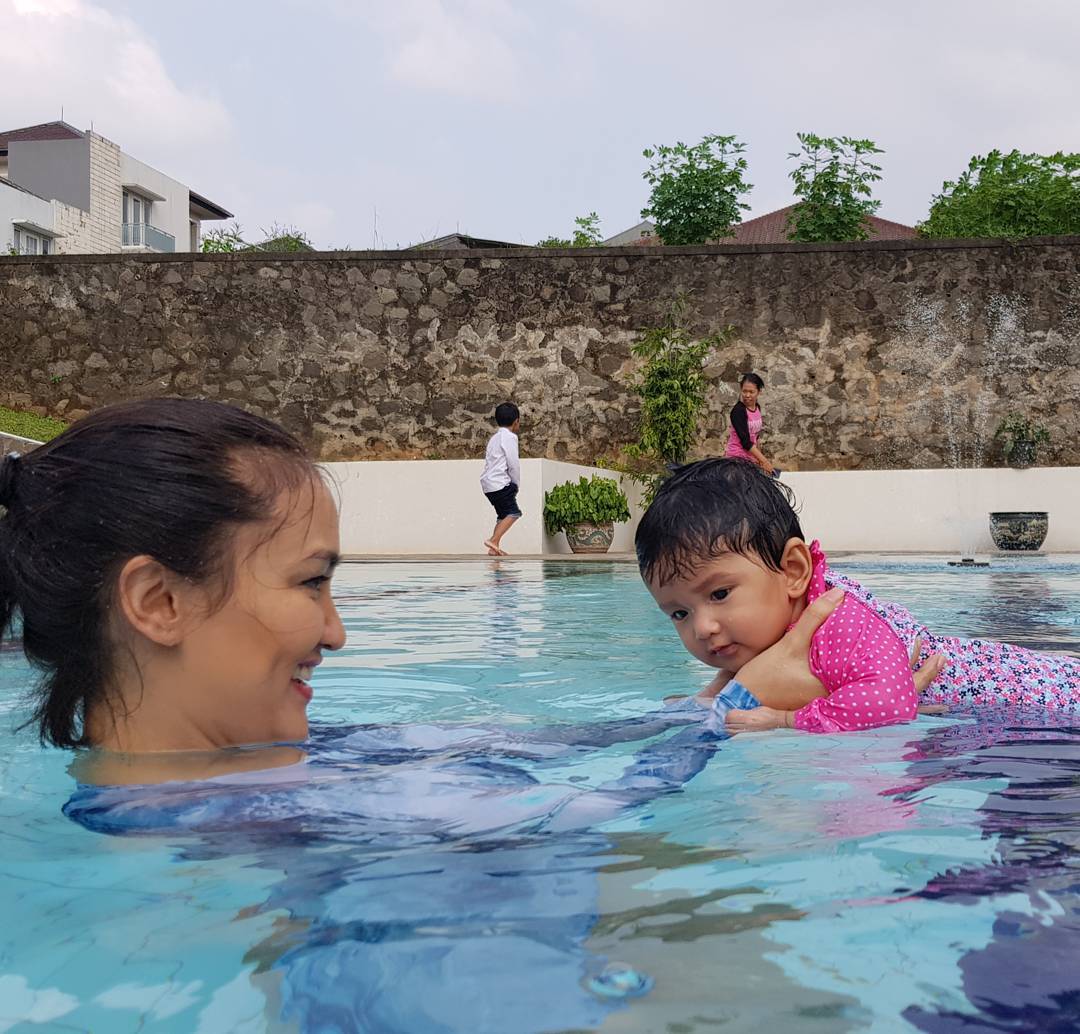 Begini cara Atiqah Hasiholan memberikan stimulus untuk Sal. Ia mengajak anak kesayangannya itu berenang untuk yang pertama kali.