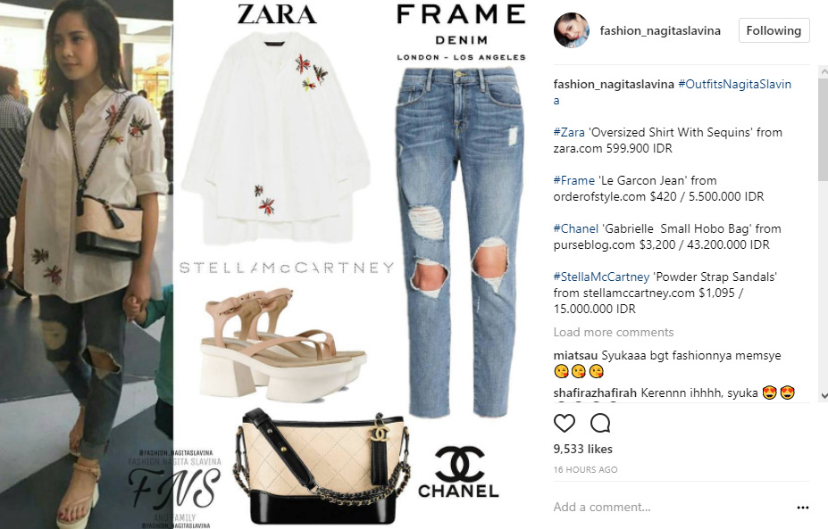 Meskipun terlihat sederhana, siapa sangka jika outfit wanita yang biasa disapa Gigi itu bernilai puluhan juta. Bahkan, total harga outfit Gigi dari ujung rambut hingga kaki mencapai Rp 64 jutaan. "#Zara 'Oversized Shirt With Sequins' from zara.com 599.900 IDR #Frame 'Le Garcon Jean' from orderofstyle.com $420 / 5.500.000 IDR #Chanel 'Gabrielle Small Hobo Bag' from purseblog.com $3,200 / 43.200.000 IDR #StellaMcCartney 'Powder Strap Sandals' from stellamccartney.com $1,095 / 15.000.000 IDR," tulis akun @fashion_nagitaslavina dalam keterangan postingannya.