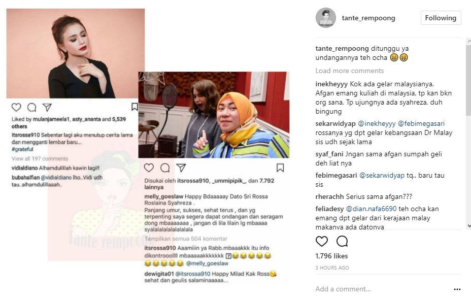 Postingan yang diunggah ulang oleh akun gosip @tante_rempoong itu pun semakin membuat netizen penasaran. Meskipun demikian, sejumlah netizen pun memberikan dukungan untuk hubungan Rossa dan Afgan.
