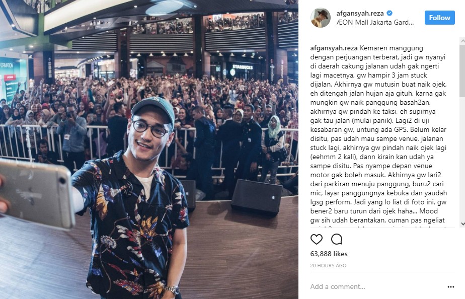 Belum lama ini, Afgan pun menceritakan pengalaman terberatnya saat akan meluncur ke lokasi konser. Saat itu, Afgan sempat terjebak macet selama 3 jam hingga akhirnya ia memutuskan untuk naik ojek. "Kemaren manggung dengan perjuangan terberat, jadi gw nyanyi di daerah cakung jalanan udah gak ngerti lagi macetnya, gw hampir 3 jam stuck dijalan. Akhirnya gw mutusin buat naik ojek," tulis Afgan dalam keterangan postingannya.