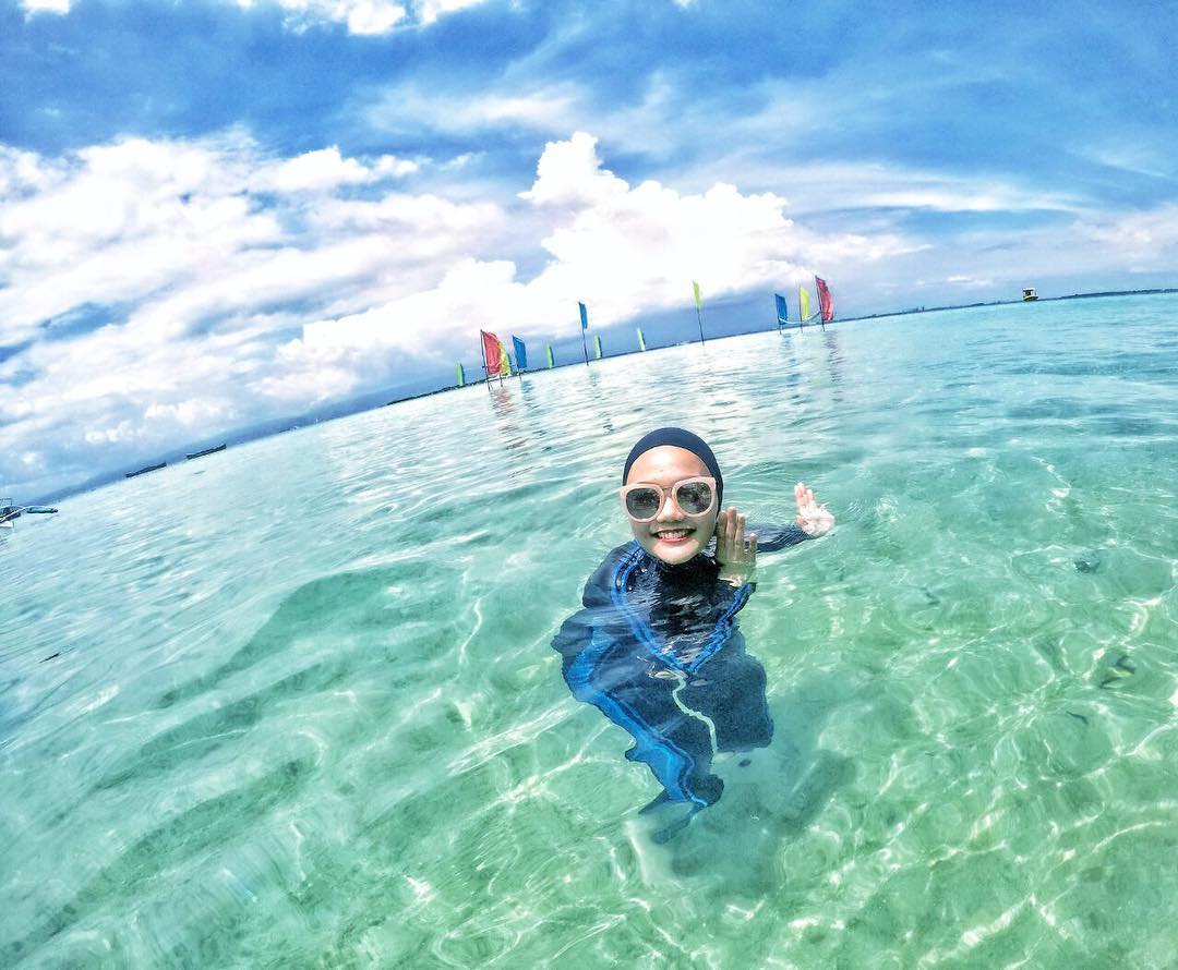Seru banget, Rina Nose juga menyempatkan diri untuk berenang di laut super bening ini.