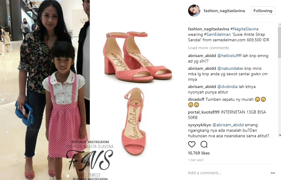 Soal harga, sepatu cantik itu cukup terjangkau. Tak seperti barang-barang fashion Gigi yang dapat bernilai hingga puluhan juta, sepatu cantik ibu satu anak itu hanya dibandrol dengan harga nyaris Rp 700 ribu. "#NagitaSlavina wearing #SamEdelman 'Susie Ankle Strap Sandal' from samedelman.com 669.500 IDR," tulis akun @fashion_nagitaslavina.