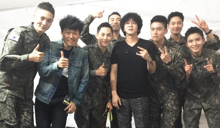 Dalam foto, Yoon Do Hyun berpose bersama rekannya dalam band YB, serta dikelilingi oleh para selebriti yang tampak tampan dibalut seragam militer lengkap. Para selebriti itu adalah aktor Joo Won, Siwan ZE:A, Ryeowook Super Junior, dan masih banyak lainnya.
