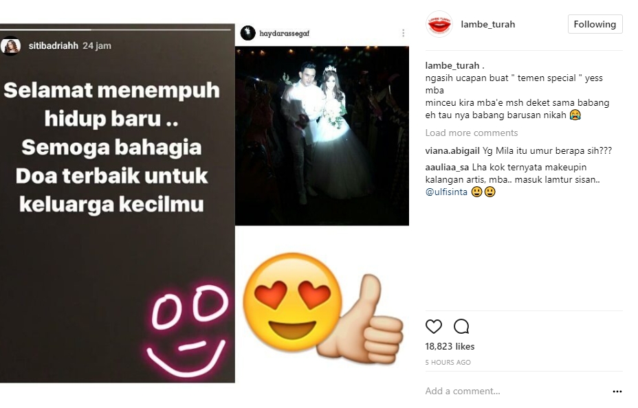 Postingan yang diunggah ulang oleh akun gosip @lambe_turah itu pun menuai berbagai komentar netizen. Mereka bahkan berharap Siti Badriah dapat bersabar lantaran teman spesialnya telah menikah.