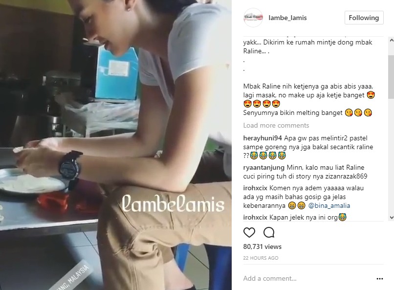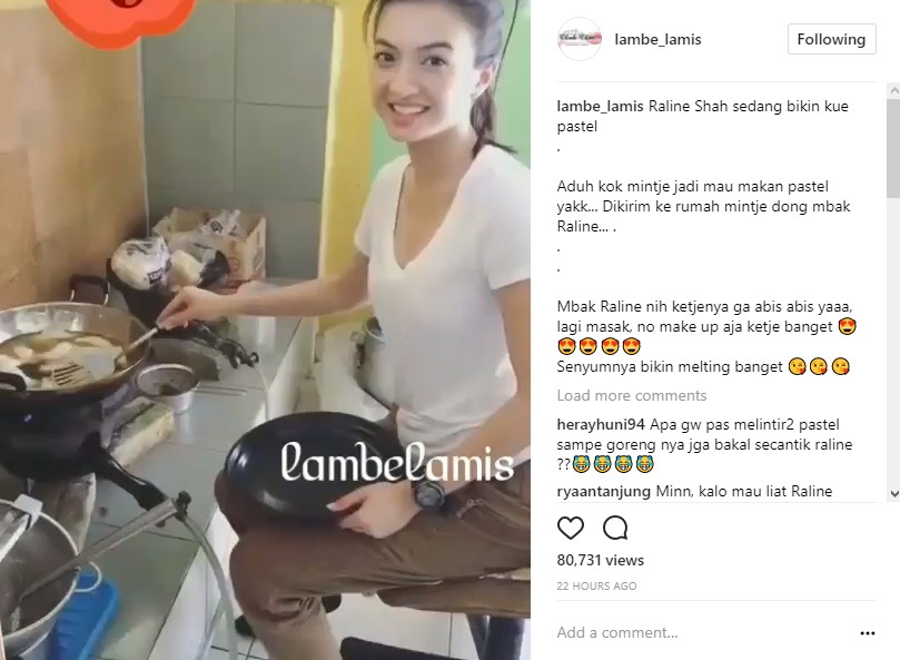 Melalui postingan akun gosip @lambe_lamis, rupanya Raline tengah berada di Malaysia. Tanpa make up dan dibalut pakaian kasual, Raline tampak membentuk beberapa kue tersebut menggunakan tangannya sendiri sambil duduk di kursi.