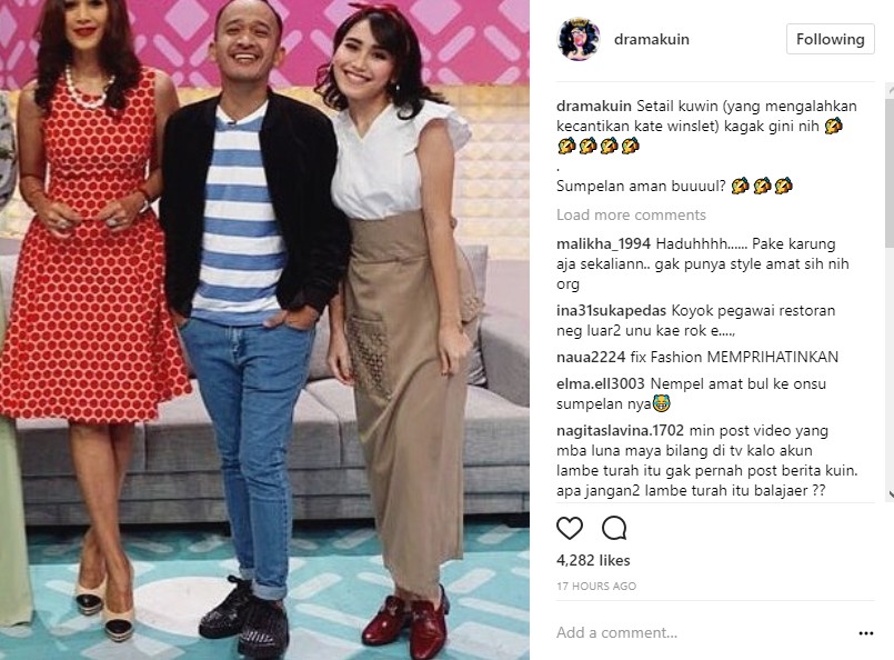 "Nora gaya nya sepatu nya juga keliatan gede hahaha," cibir @r*****nza89. "Kuin ini siapa ya penata busananya.... Kalau si Yani ya saya maklum banget kalau baju baju ubul ra ono sing nggenah," ujar @i*****eliala. "Baju,rok,sepatu sama sekali ga sinkron..pake bando lg...hadeeuhh penampilan loe parah bet bull..masa artis vavan atas norak gitu..dada jg tlg dikondisikan atuh bull...bull@ayutingting92," imbuh @m******ama.