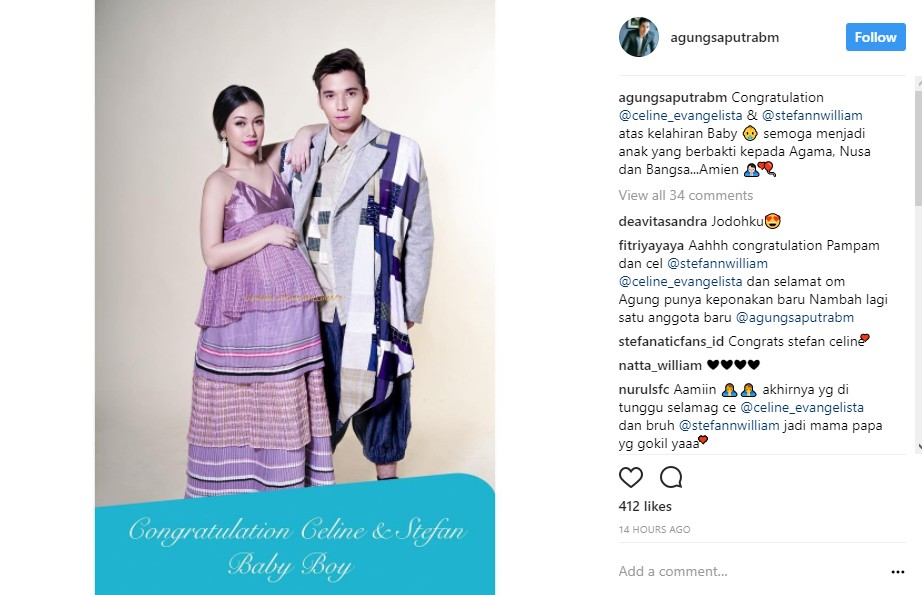 Sontak, tak sedikit netizen yang memberikan ucapan selamat pada Celine dan Stefan. "Aahhh congratulation Pampam dan cel @stefannwilliam @celine_evangelista dan selamat om Agung punya keponakan baru Nambah lagi satu anggota baru @agungsaputrabm," ujar @fi******aya. "Alhamdulillah selamat ya mom @celine_evangelista ded @stefannwilliam atas kelahiran baby boy nya .." ujar @****_hr. "Congrat..@celine_evangelista @stefannwilliam," imbuh @fa******977.ofc.