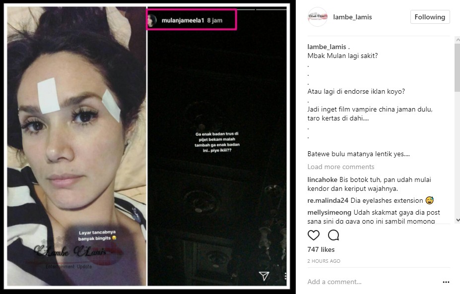 Tak hanya itu, Mulan juga membagikan foto yang memperlihatkan kondisi kesehatannya. Terlihat dua koyo menempel, tepatnya di pelipis kiri dan diantara kedua alisnya. "Layar tancabnya banyak bingits," imbuh Mulan dengan emoji menangis.