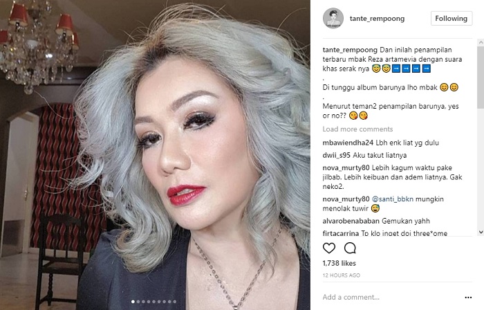 Dalam postingan itu, terlihat Reza yang dihiasi oleh make up yang tak begitu tebal. Tampak pula bibirnya dipoles lipstik berwarna merah. "Dan inilah penampilan terbaru mbak Reza artamevia dengan suara khas serak nya," tulis akun gosip @tante_rempoong dalam keterangan postingannya.
