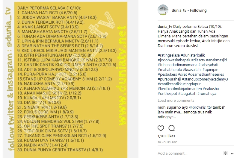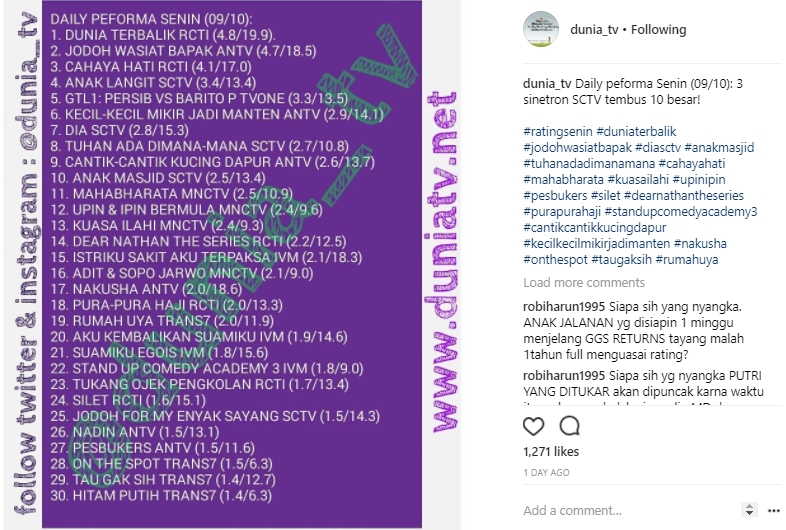 "Percuma jg yah..sctv bikin sinetron baru hasilnya ternyata sama dan kini indosiar yg kembali jd tv no 3 coba kisah nyata pindah di primetime mungkin lbh baik lagi," kata u****t. "Tuhkan sinetnya @sctv rating tinggi hanya pada episode awal dan akhir, udah mini series aja biar ratingnya stabil," saran so*****17_. "Sinet DIA yg di banggain kok gitu baru 2 eps nyungsep .. Eps yg lain gimana," komentar sin*****yo.
