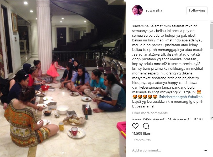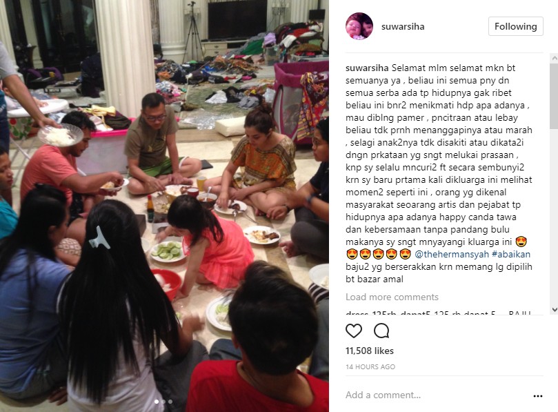 Belum lama ini, pengasuh anak Anang dan Ashanty, Suwarsih Asih membagikan momen yang tak biasa. Dengan pakaian santai, terlihat Anang dan Ashanty tengah duduk di lantai sambil menikmati makan malam bersama para anak-anak serta para karyawannya. "Selamat mlm selamat mkn bt semuanya ya , beliau ini semua pny dn semua serba ada tp hidupnya gak ribet beliau ini bnr2 menikmati hdp apa adanya," tulis Suwarsih dalam keterangan postingannya.