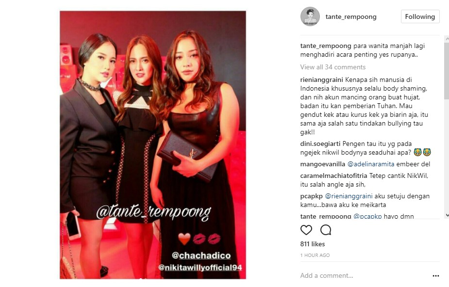 "Nikita body nya kok montok bgt kyk eike yg dah emak2," sindir @ya*******an. "itu tante NikWil? ngapa geda banget dan lebih tuwir yang udah pada nikah yeee," cibir @ad********ita. "nikwil emg lagi gemuk tauu, kan dia habis holiday, dia pernah bilang kalau gain some kg after holiday di ig story dia," timpal @o******obae.