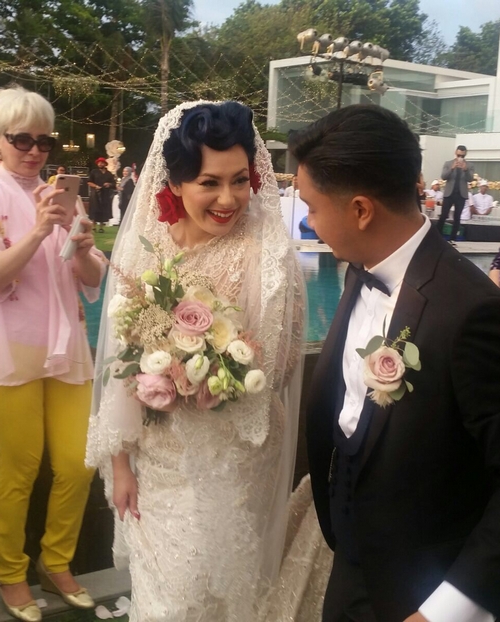 Kebaya putih dengan bahan brokat yang ia gunakan rancangan seorang designer ternama bernama Anji Asmara.