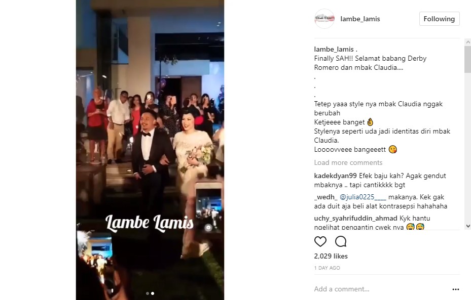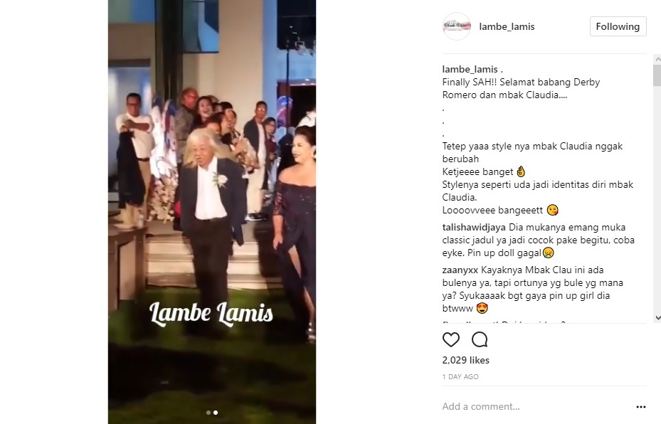 Acara yang berlangsung tertutup itu berjalan secara khidmat dengan dihadiri kerabat terdekat saja. Di tepi pantai dengan saksi sejumlah kerabat dekat, Derby dan Claudia pun mengikat janji suci pernikahan mereka. Saat itu, Derby tampak gagah dibalut dengan tuxedo hitam. Di sisi lain, Claudia terlihat menawan dengan balutan gaun panjang serta riasan vintage seperti biasanya.
