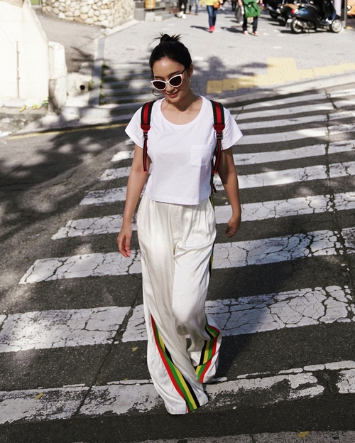 Tatjana tampil kasual hanya dengan kaus longgar, celana palazzo ditambah kacamata hitam yang kece banget!