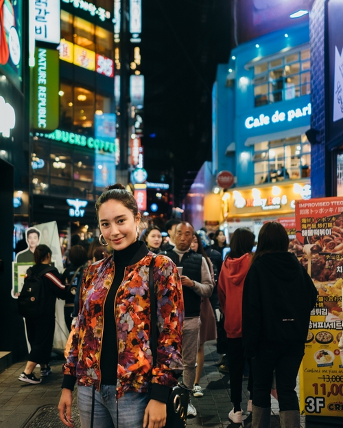 Malam harinya, gadis 20 tahun itu berkeliling sudut kawasan Myeongdong untuk menikmati hiruk pikuk turis di sana.