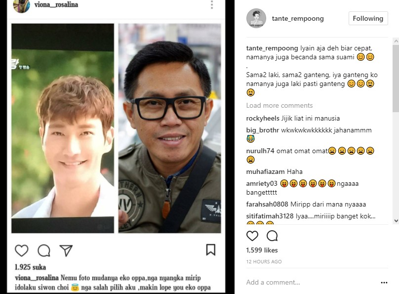 Ternyata, Viona menyandingkan foto sang suami dengan seorang aktor tampak yang berasal dari Korea, Choi Siwon. Bukan tanpa makna, Viona rupanya menilai wajah Choi Siwon mirip dengan Eko Patrio saat masih muda. "Nemu foto mudanya eko oppa,nga nyangka mirip idolaku siwon choi nga salah pilih aku ,makin lope you eko oppa," tulis Viona dalam keterangan postingannya.
