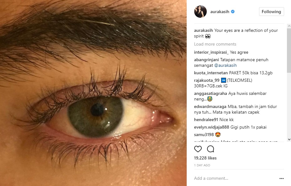 Bukan foto wajah sang kekasih, Aura Kasih justru dikabarkan membagikan potret mata pacar bulenya. Dalam postingan tersebut, terlihat iris mata berwarna hijau. Alis tebal serta bulu mata lentik juga terlihat dalam postingan itu. "Your eyes are a reflection of your spirit (Matamu merupakan cerminan dari semangatmu)," tulis Aura Kasih dalam keterangan postingannya baru-baru ini.