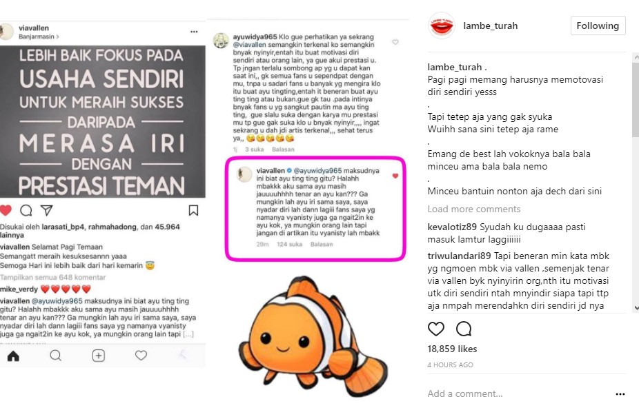 Hal tersebut bermula dari postingan Via di akun Instagram pribadinya terkait motivasi diri. Dalam postingannya itu, Via seolah ingin menggiring para penggemeranya untuk terus berusaha meraih kesuksesan tanpa merasa iri dengan keberhasilan teman. "Selamat Pagi Temaan Semangatt meraih kesuksesannn yaaa Semoga Hari ini lebih baik dari hari kemarin," tulis Via dalam keterangan postingannya, Rabu, 18 Oktober.