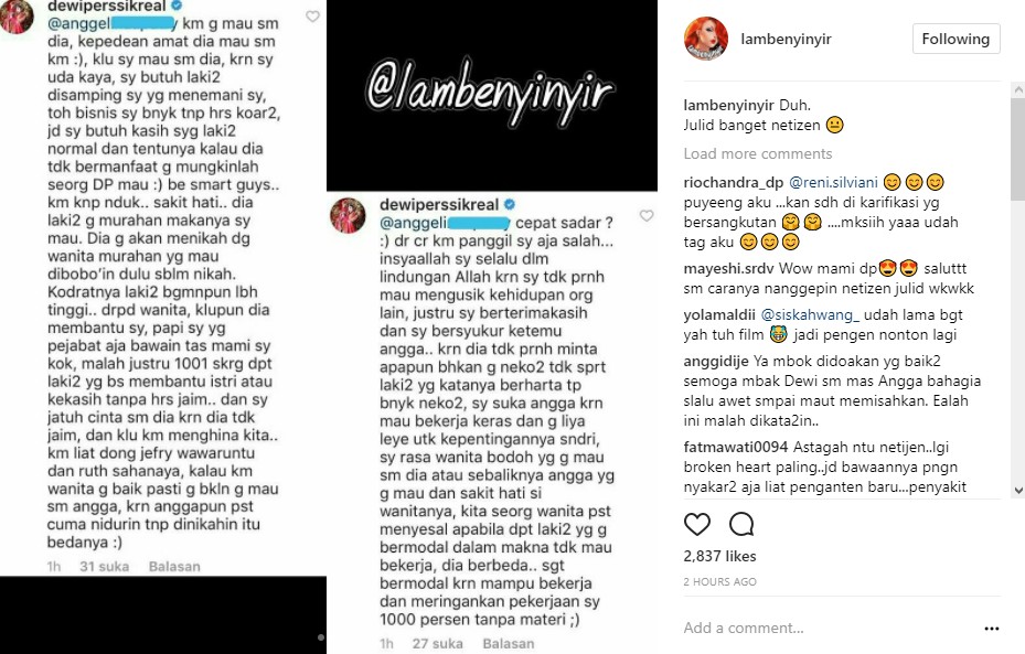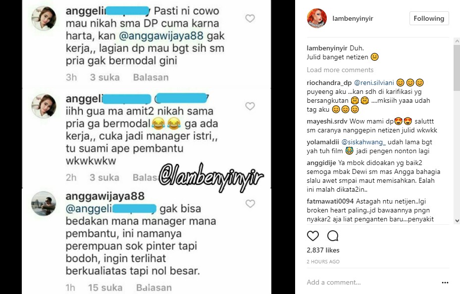 Seperti baru-baru ini, seorang netizen tiba-tiba melayangkan komentar pedas pada Angga. Ia menyebut bahwa Angga rela menikahi Dewi Persik karena hartanya saja. Bahkan, netizen yang tak disebutkan namanya itu menyebut jika Angga tak bermodal.