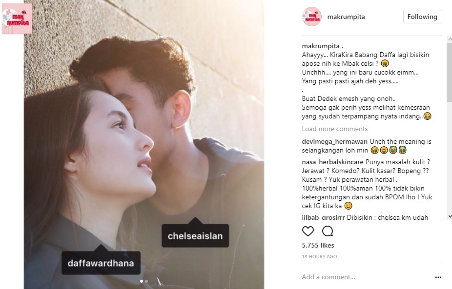 Seperti baru-baru ini, Chelsea berani tampil mesra dengan Daffa. Melalui postingan yang diunggah ulang oleh akun gosip @makrumpita, Daffa seolah sedang membisikkan sesuatu di telinga Chelsea. "Ahayyy... KiraKira Babang Daffa lagi bisikin apose nih ke Mbak celsi ? Unchhh.... yang ini baru cucokk eimm...Yang pasti pasti ajah deh yess....." tulis akun gosip tersebut melalui keterangan postingannya.