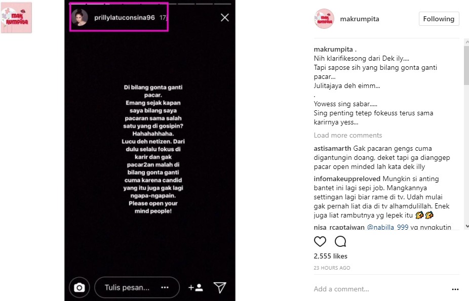 Selama ini, Prilly tampak diam menanggapi gosip miring itu. Sekian waktu berlalu, Prilly seolah tak tahan dengan berbagai tanggapan miring netizen yang dilayangkan padanya. Akhirnya, Prilly pun memberi klarifikasinya melalui postingan di Instagram Story. "Di bilang gonta ganti pacar. Emang sejak kapan saya bilang saya pacaran sama salah satu yang di gosipin? Hahahahhaha. Lucu deh netizen," tulis Prilly seolah kecewa dengan anggapan miring publik terhadapnya.