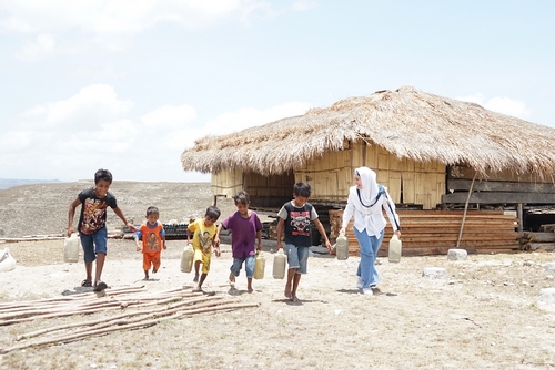 Dewi juga menyempatkan diri untuk berbaur dengan anak-anak di Sumba, ia bahkan membantu mereka mencari air di sumber.