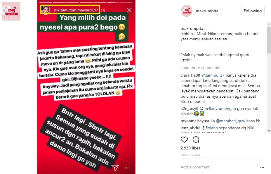"Pada bego ato gmn sih? Baca dengan bener NIKITA ga ngmg jkrt sekarang semrawut. Tapi die ngmg : sebentar lagii apa yg sudah disusun dengan rapih, bakalan ancur2an. Ga suka sm orgnya gpp tp emg bener sih mnrt g pendapatnya. Br bbrp jam aj memimpin kok kata2nya ud memicu perpecahan bangsa. Pribumi dan nonpribumi..." kata @novie_******an. "Kali ini setuju sama nikmir," imbuh @a*****_rara. "Kali ini sependapat sama mbak niki," timpal @f*****p.