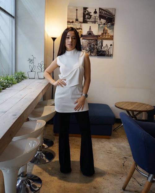 Selanjutnya ia mengganti atasannya dengan baju berwarna senada dengan model unik yang memperlihatkan salah satu lengan mulusnya.