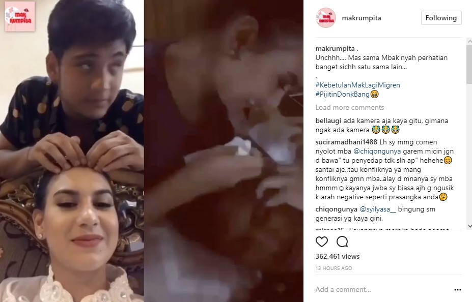 Sambil sedikit merebahkan diri di kursi, Irish Bella tampak menikmati pijatan lembut Giorgino. "Pusing banget," kata Irish Bella. "Hmm? Tukang pijit, nih. Mahal bayarnya," canda Giorgino sambil melihat ke arah kamera. "Nanti make up-nya rusak," imbuh Irish Bella saat Giorgino menyentuh area hidungnya.