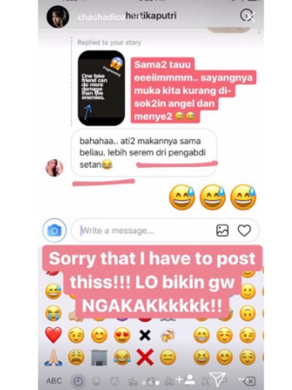 "Bahaha. Ati2 makanya sama beliau. Lebih serem dari pengabdi setan," tulis Hertika Putri. "Sama-sama tau eeeeiimmm. Sayangnya muka kita kurang disok-sokin angel dan menye-menye," balas Chacha.