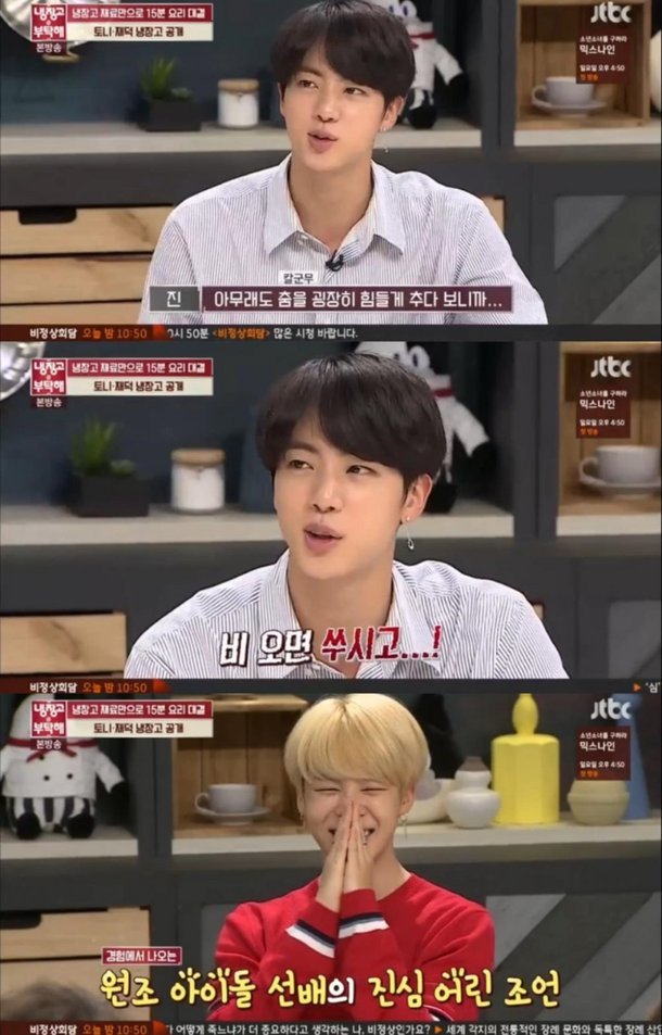 Selanjutnya, Jin dan Jimin pun ditanya apakah mereka juga mengonsumsi suplemen dan pil seperti senior mereka tersebut. Jin pun menjawab, "Kami belum sampai mengonsumsi pil, tapi karena kami melakukan koreografi yang sulit, tubuhku cenderung sakit saat sedang hujan. Aku tidak tahu kenapa punggungku lebih sakit daripada biasanya dan ternyata di luar sedang hujan."