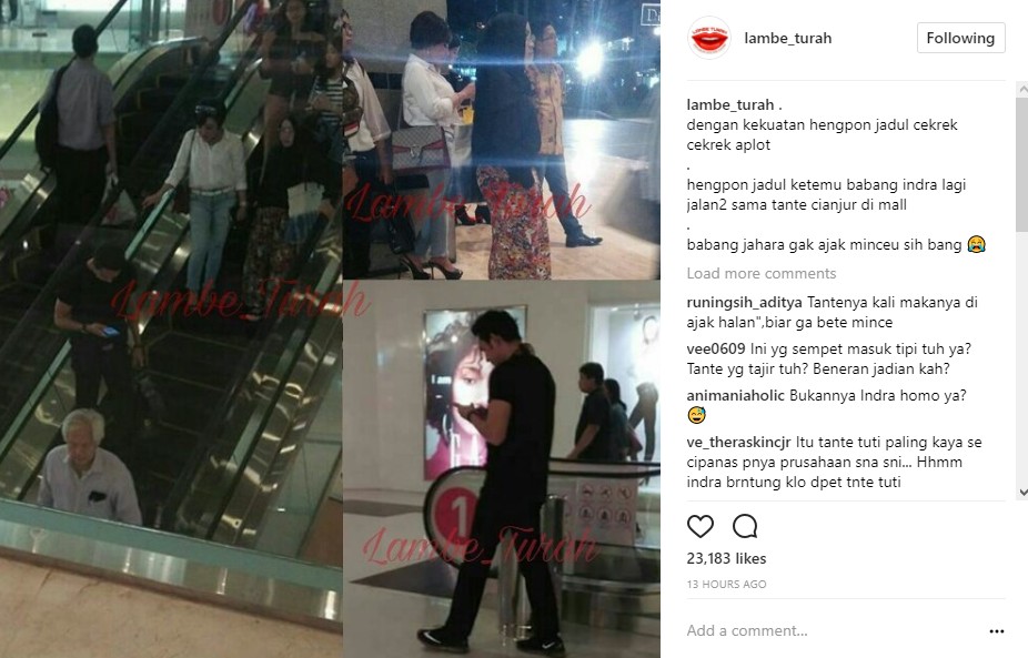 Dalam postingan yang mencakup beberapa foto, ada wanita yang berdiri tak begitu jauh dari Indra. Saat itu, ada dua wanita yang salah satunya berpenampilan kasual. sedangkan wanita lainnya mengenakan hijab. "hengpon jadul ketemu babang indra lagi jalan2 sama tante cianjur di mall. babang jahara gak ajak minceu sih bang," tulis akun gosip tersebut dalam keterangan postingannya.