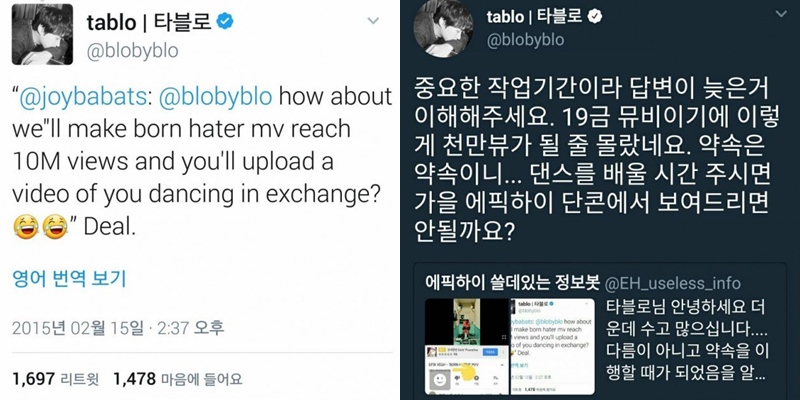 Pada waktu itu, member Epik High tersebut berjanji mengunggah sebuah video yang memperlihatkannya menari jika MV mereka yang berjudul, "Born Hater" bisa mencapai 10 juta penonton. Sejujurnya, Tablo sendiri tidak yakin MV tersebut bisa mencapai 10 juta penonton karena memiliki persyaratan umur 19+ di mana tak semua orang bisa melihatnya.