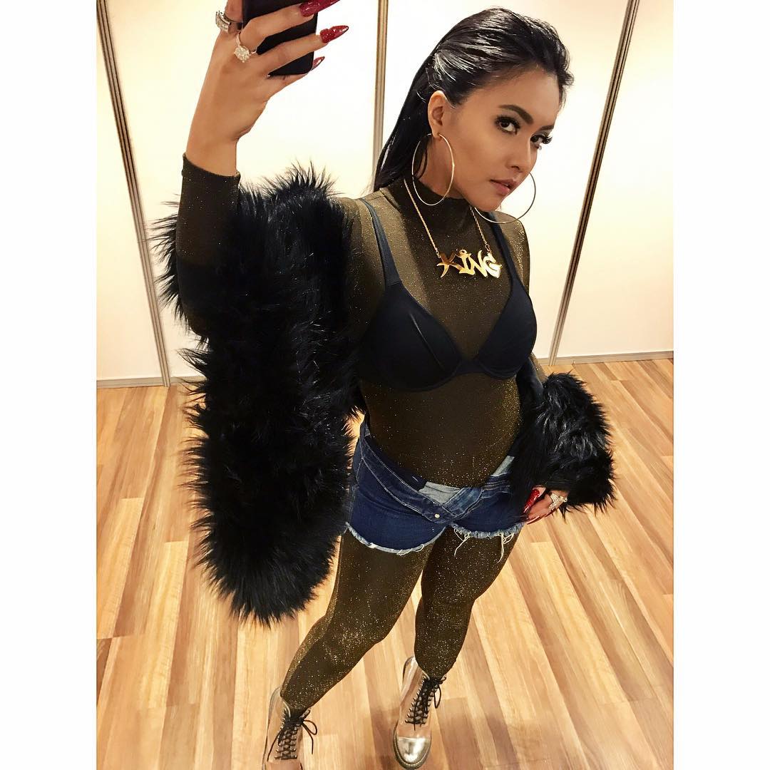 Denada mengenakan busana super ketat dengan bra yang ia kenakan di luar baju utama. Bagaimana? Keren?