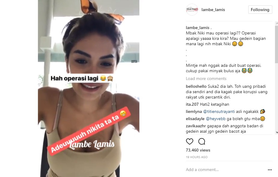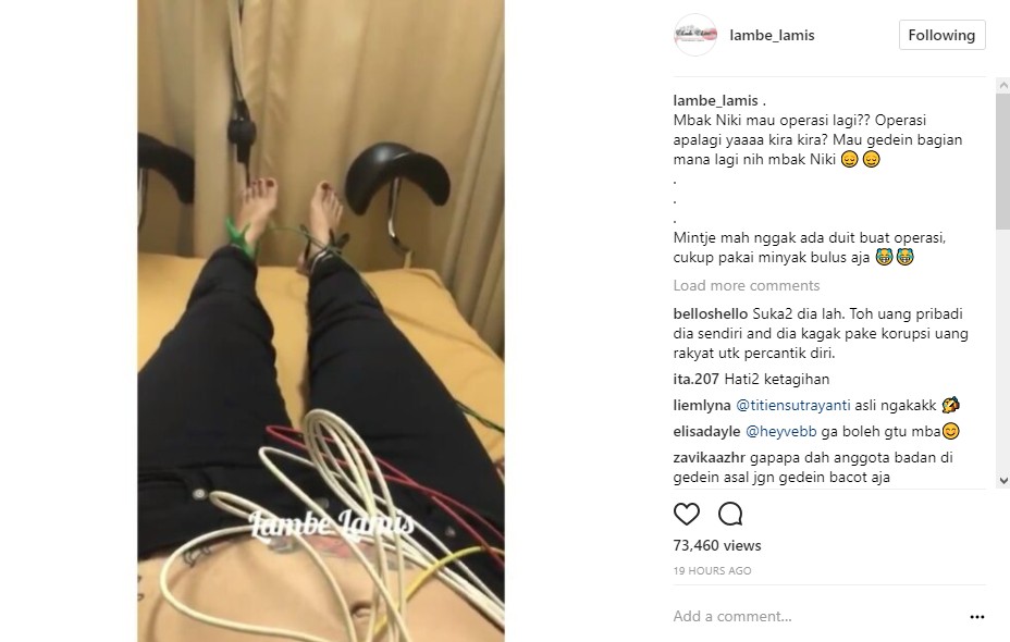 Melalui postingan akun gosip @lambe_lamis, mula-mula Niki mengatakan bahwa dirinya tengah melakukan pemeriksaan darah sebelum operasi. Sambil terbaring di ranjang, beberapa kabel EKG terlihat berada di pergelangan kaki, tangan hingga perut Niki. "Mbak Niki mau operasi lagi?? Operasi apalagi yaaaa kira kira? Mau gedein bagian mana lagi nih mbak Niki," tulis akun gosip tersebut dalam keterangan postingannya, Rabu, 25 Oktober.