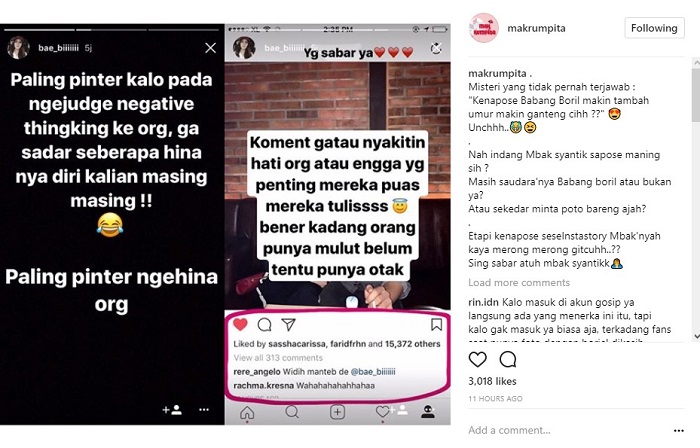 Seolah komentar yang dilayangkan pada Nabiilla berisi hujatan, selebgram cantik itu pun menulis curahan hatinya melalui Instagram Story. "Paling pinter kalo pada ngejudge negative thingking ke org, ga sadar seberapa hina nya diri kalian masing masing !!" tulisnya. "Koment gata nyakitin hati org atau engga yg penting mereka puas mereka tulissss bener kadang orang punya mulut belum tentu punya otak," ucap Nabilla seolah menyalurkan kekesalannya.